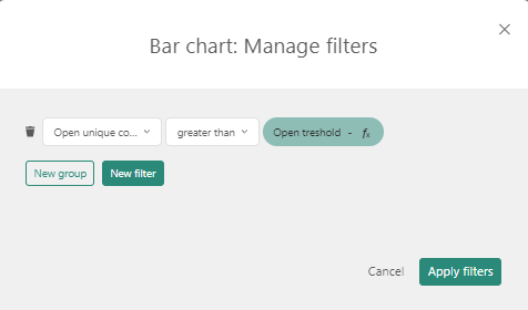 To add a new filter, click the Add a filter button. You can filter both your dashboard and any individual chart using an OR condition. To do that, simply add a filter to your dashboard via the Filters menu. If you don’t want to apply the filter across all your charts, in the same menu, you can choose a specific chart to filter on. You can also do it by going to the data settings of your chart and clicking Add filter. The following Filter dialog is displayed: