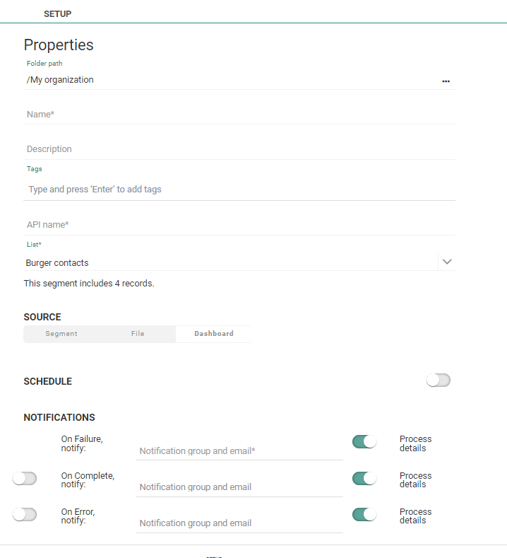 6. If required, configure the schedule of the static segment updates. This performs an automatic update of the static segment at regular time intervals. When saving the configuration, the static segment is created immediately and data is loaded. The schedule details and update history is visible from the Segments overview in the Lists chapter.