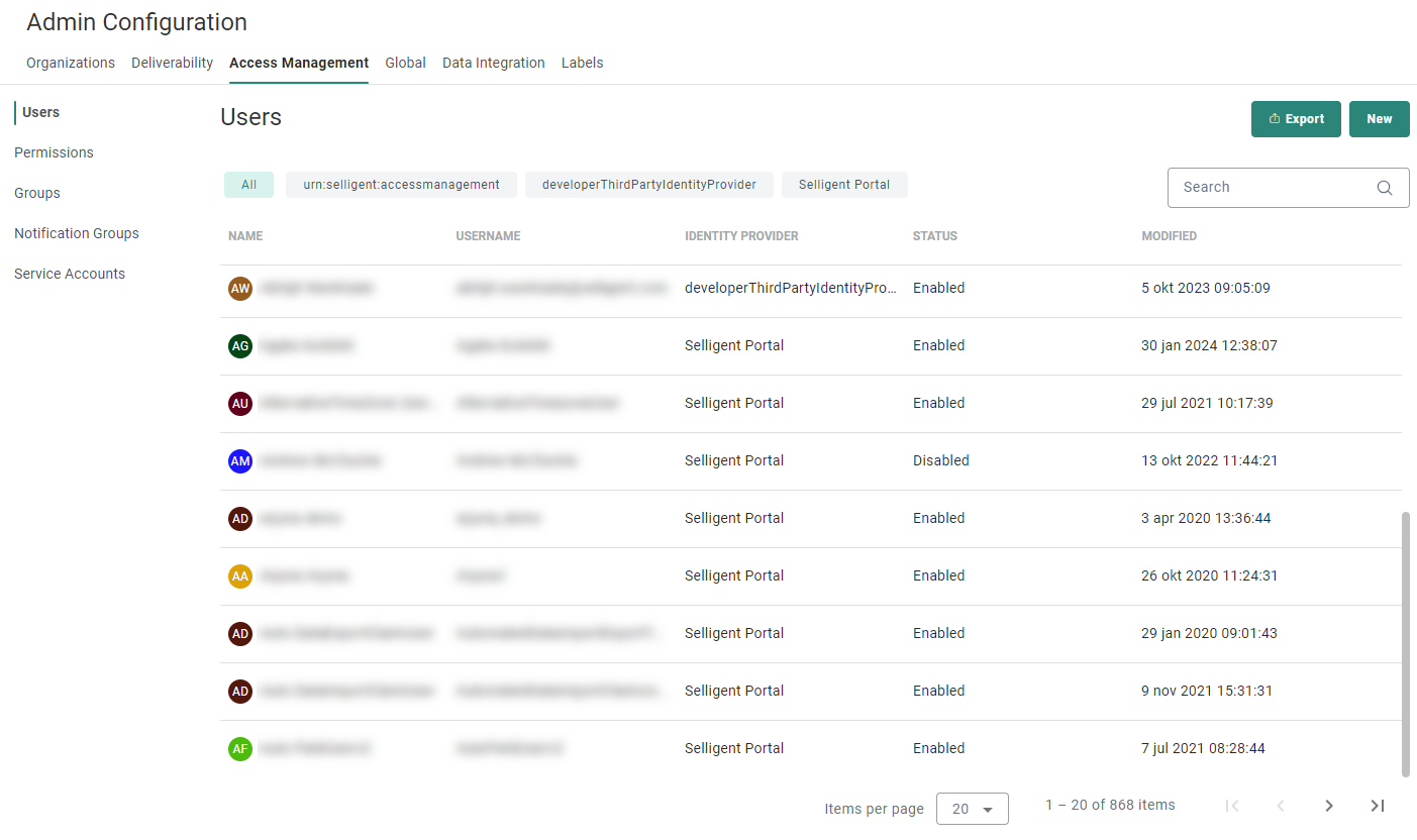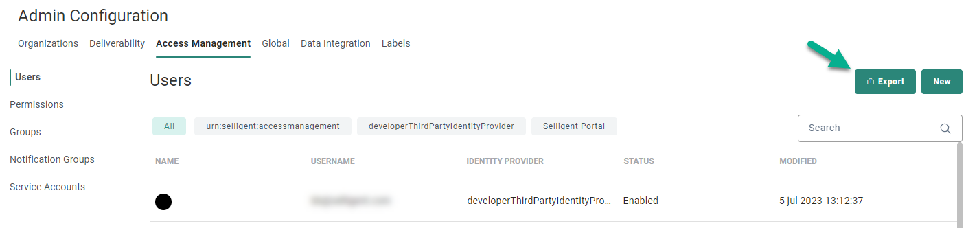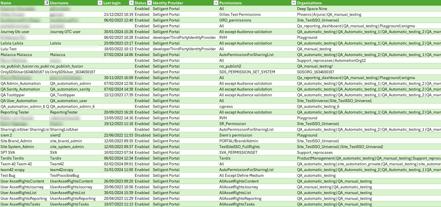 • Filter the users per Identity provider through the filter tabs at the top. There is by default a filter for 'All', and for 'Selligent Portal'. Any third party identity provider used on the platform will be listed as well.