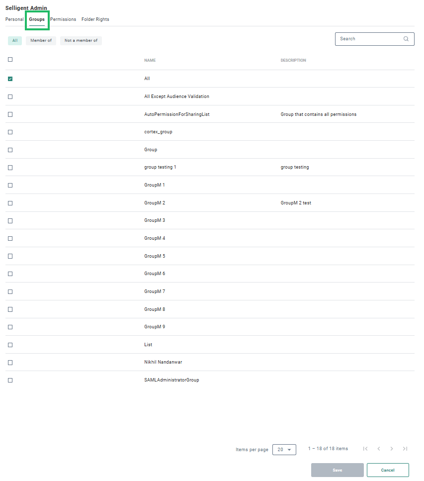 • Groups can be filtered to show 'All', 'Member of' or 'Not a member of'.