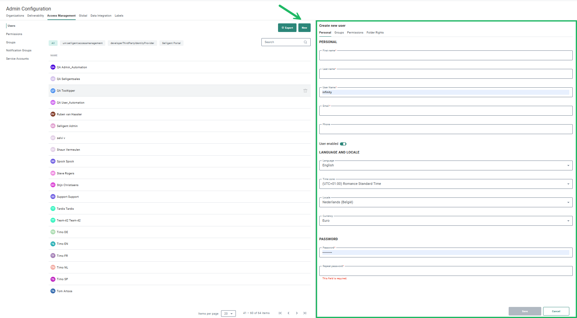 The Users section in the Admin Config Tool is where the system administrator can create and configure all the users of your platform, with their language, time zone and currency preferences. User permissions and Folder rights can be consulted here, per individual user and per Business unit. However, managing these rights is done on Group level.