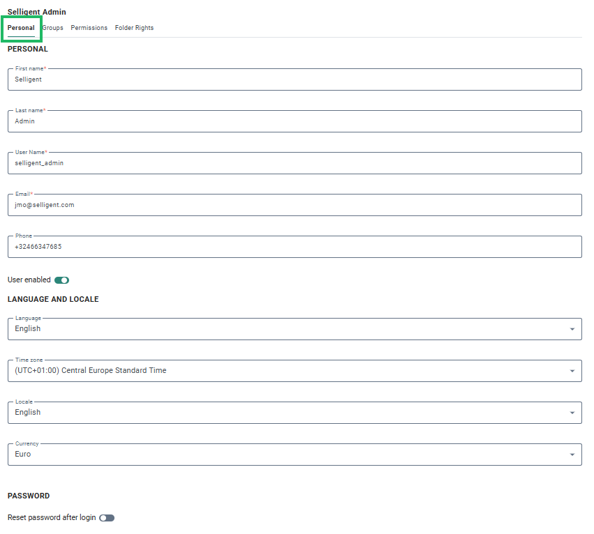 • Reset password after login — This will oblige the user, when set, to change his password after logging in. A password reset email is sent.