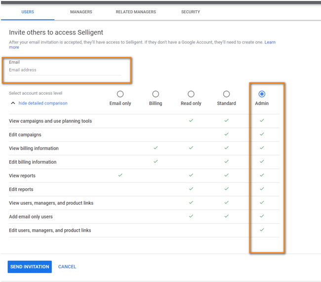 2. Fill in an email address, select Admin as option and click on ‘Send Invitation’.