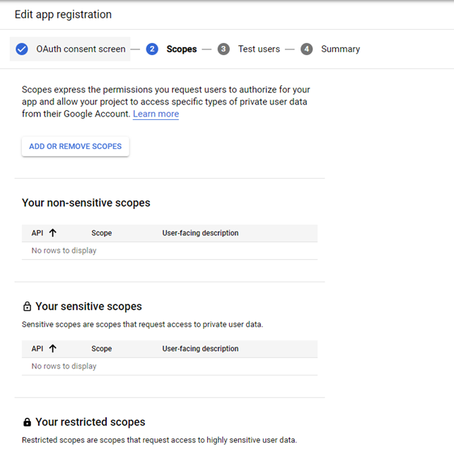 7. On the ‘Scopes’ tab, select your scopes and click on the ‘save & continue’.