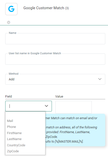 When using the Google Customer Match Component in a journey and selecting the above instance, the list of fields used for mapping can be added manually by selecting those within the drop-down list: