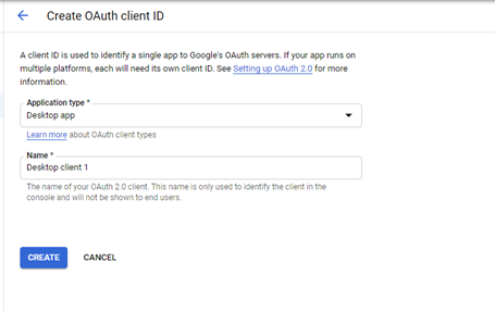 11. Select ‘Desktop app’ as application type and provide a name. Once filled out, click on ‘Create’.
