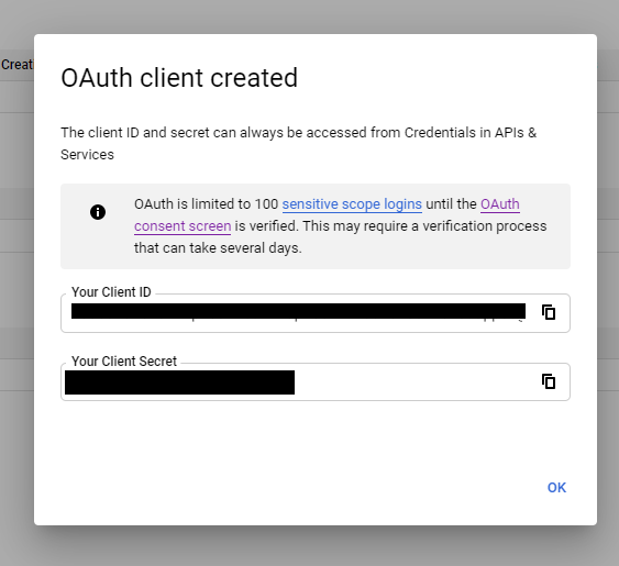 Select the project in scope. You’ll notice that the OAuth2 section has one listed. Click on it to receive the clientid & clientsecret.