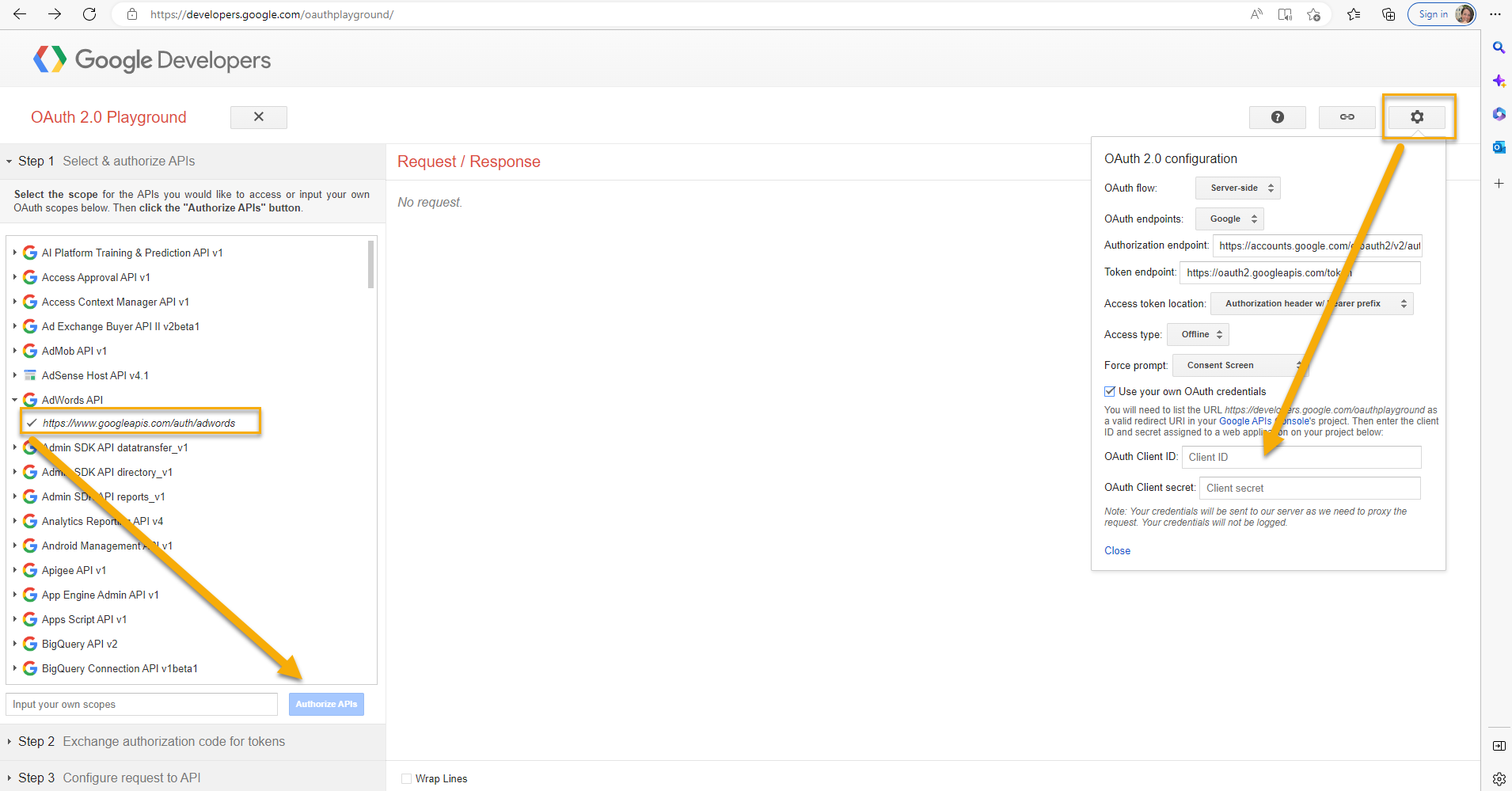 1. Go to https://developers.google.com/oauthplayground and on the Configuration screen fill out the Client ID and secret.
