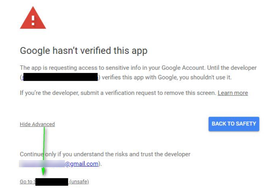 4. If a warning is displayed, ignore it and click the Advanced link below and then click Go to your app.
