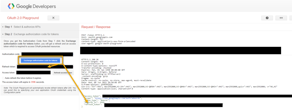 6. Next, in the OAuth page, the second step is displayed, containing a blue button 'Exchange authorization codes for tokens'. Click it to refresh and reveal the refresh_token and the access_token.