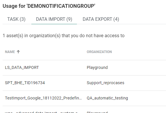 If a notification group is not used at all, a corresponding message is shown.Example of a notification group that is used in 3 tasks, 4 data exports and 9 data imports, from which the user can't access 1 asset because they do not have access to its Business unit :