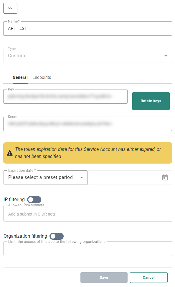 Note: When the expiration date has been reached, the key and secret can be renewed directly from within the Service Account configuration panel. Click 'Renew' and a new key and secret are created. You can also set a new expiration date in which case the key and secret remain unchanged.
