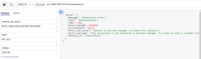 - Issue : "Facebook.FacebookOAuthException: Permissions error -> Connect to Custom Audience Terms Not Accepted" :