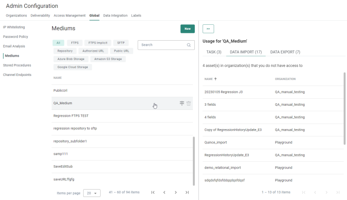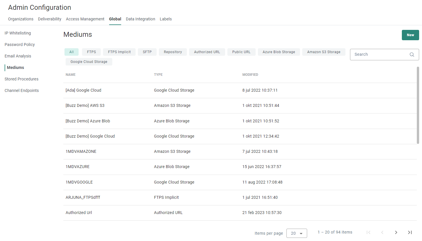 Different tabs are shown to make a distinction between the type of medium, on which can be filtered — All, Repository, Authorized URL, Public URL, Azure Blob Storage, Amazon S3 Storage, Google Cloud Storage, FTPS, FTPS Implicit, SFTP.