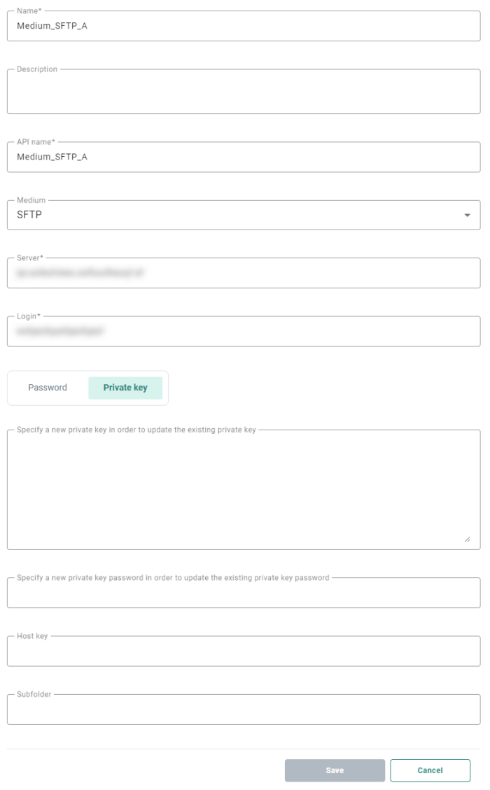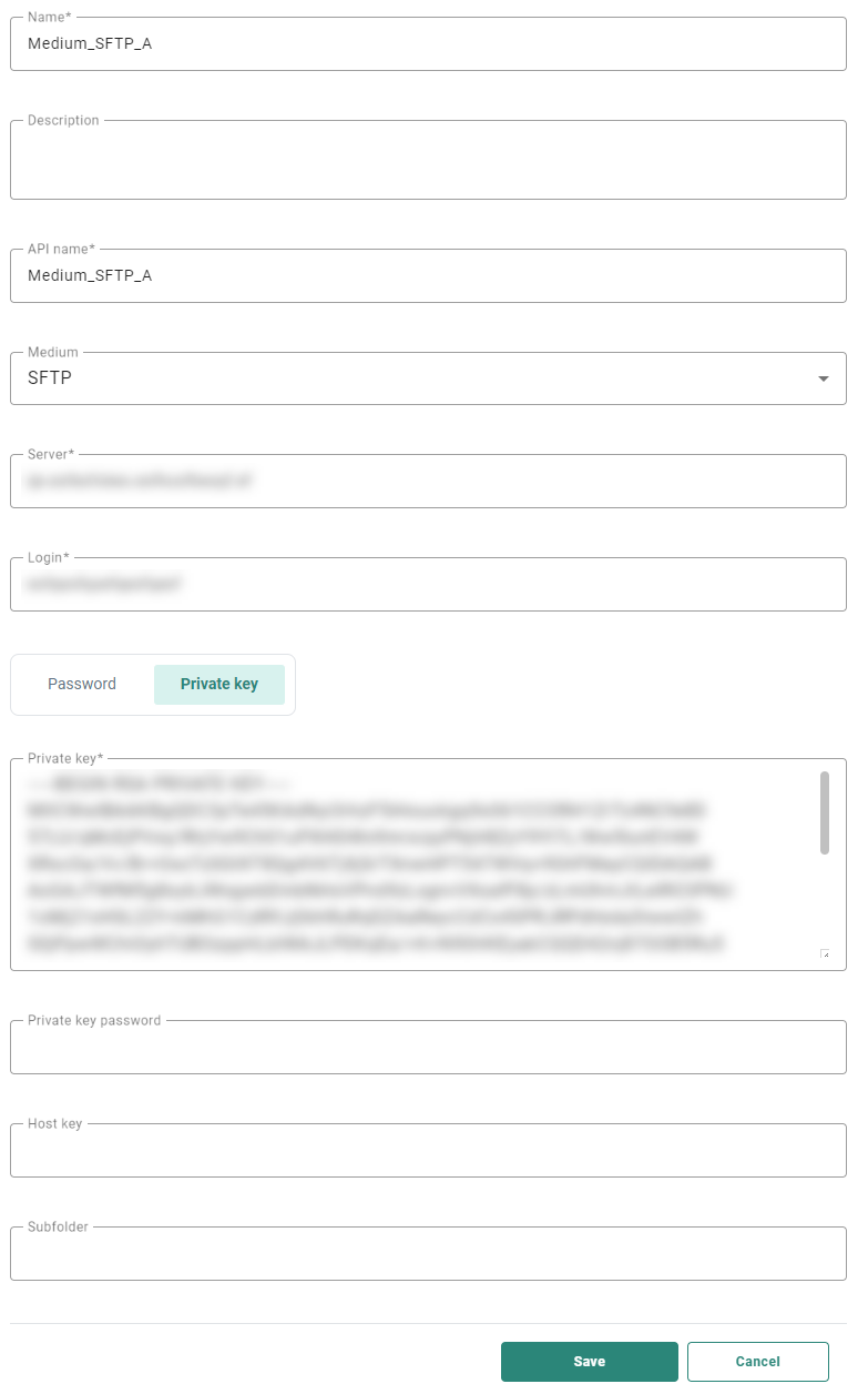 Note: The data from both fields (private key and private key password) is stored encrypted in the database, and only used when transferring the files.