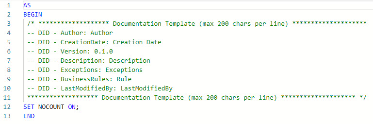 Below you can find some additional explanations on the documentation header used in a Stored Procedure:
