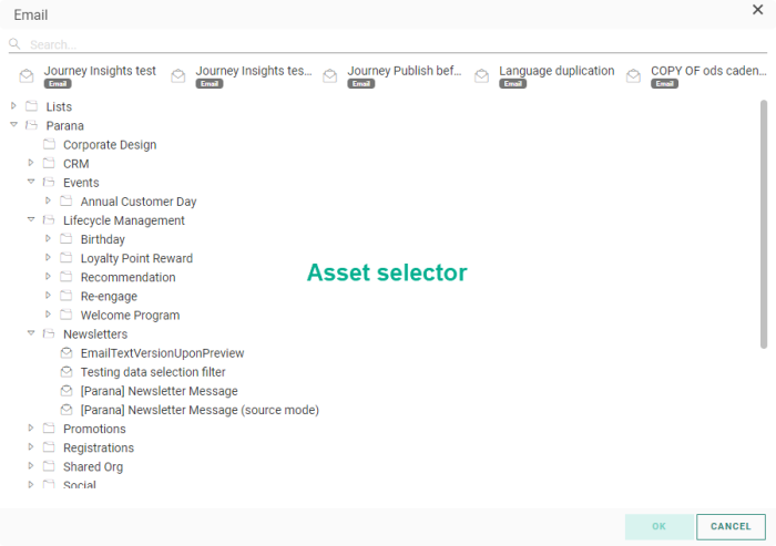 The Asset Selector allows marketers to easily search for and select content for use in journeys. The Asset Selector has the same folder structure as used in the chapters.