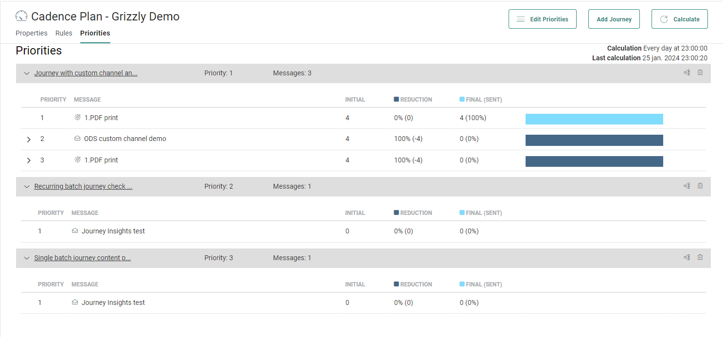 - After tomorrow, the Cadence plan considers the journey as no longer being relevant, as a week has passed by in which no emails were sent. The journey will be removed from the Cadence plan Priorities screen, as it already ended and does not send out any more emails.