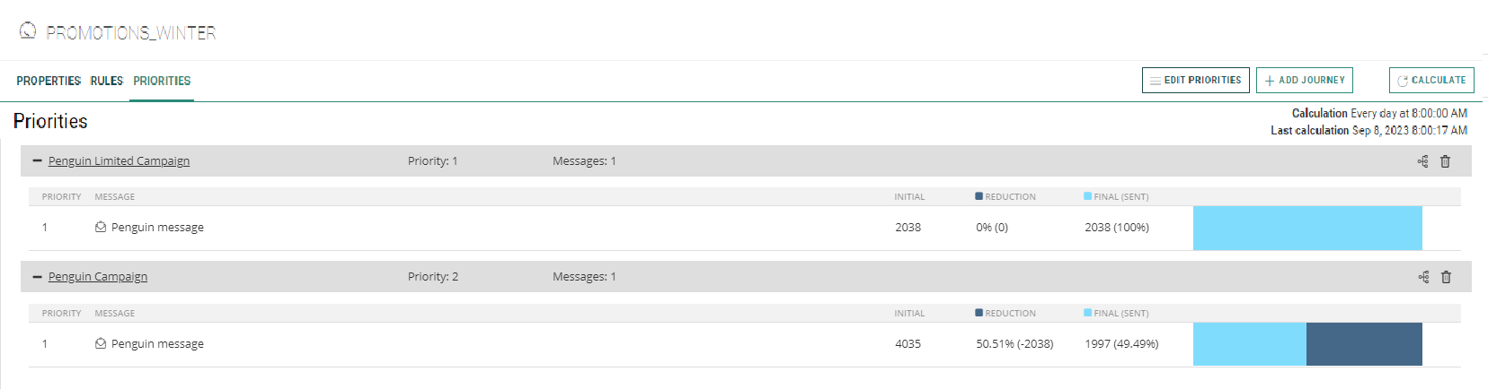 When a plan is calculated, the reduction numbers of the target for each one of the messages in the plan is updated and provides information on how many contacts were initially targeted and how many will actually get the message.