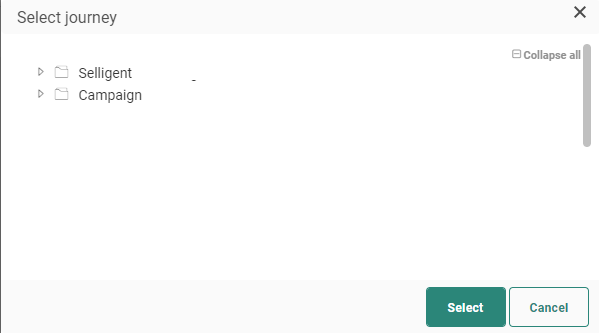 You can choose from all Single Batch Journeys , Recurring Batch Journeys and Custom Journeys. Only published Selligent by Zeta journeys are available.