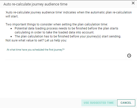 Auto re-calculate journey audience time — Set the time of the day at which the target audience should be re-calculated automatically. This will make sure that the number of contacts targeted for each journey in the plan is up to date, taking the rules into account and the communications already sent out.