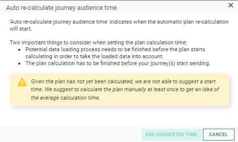 A button 'Auto re-calculate journey audience time?' helps the marketer in deciding what is the best time to re-calculate the target audience, based on average re-calculation times and the launch time of the first journey in the plan. Click the button to display the following dialog: