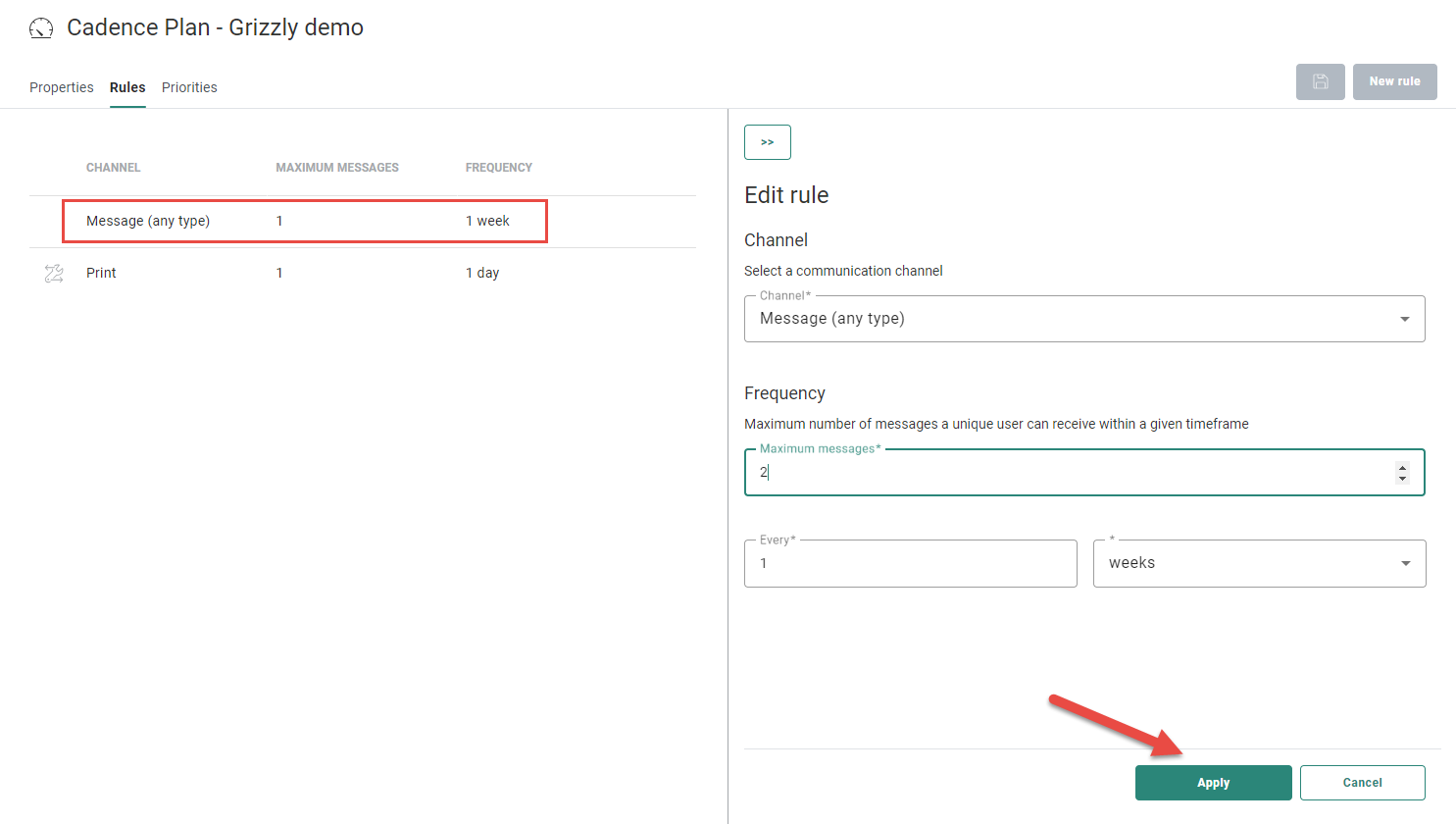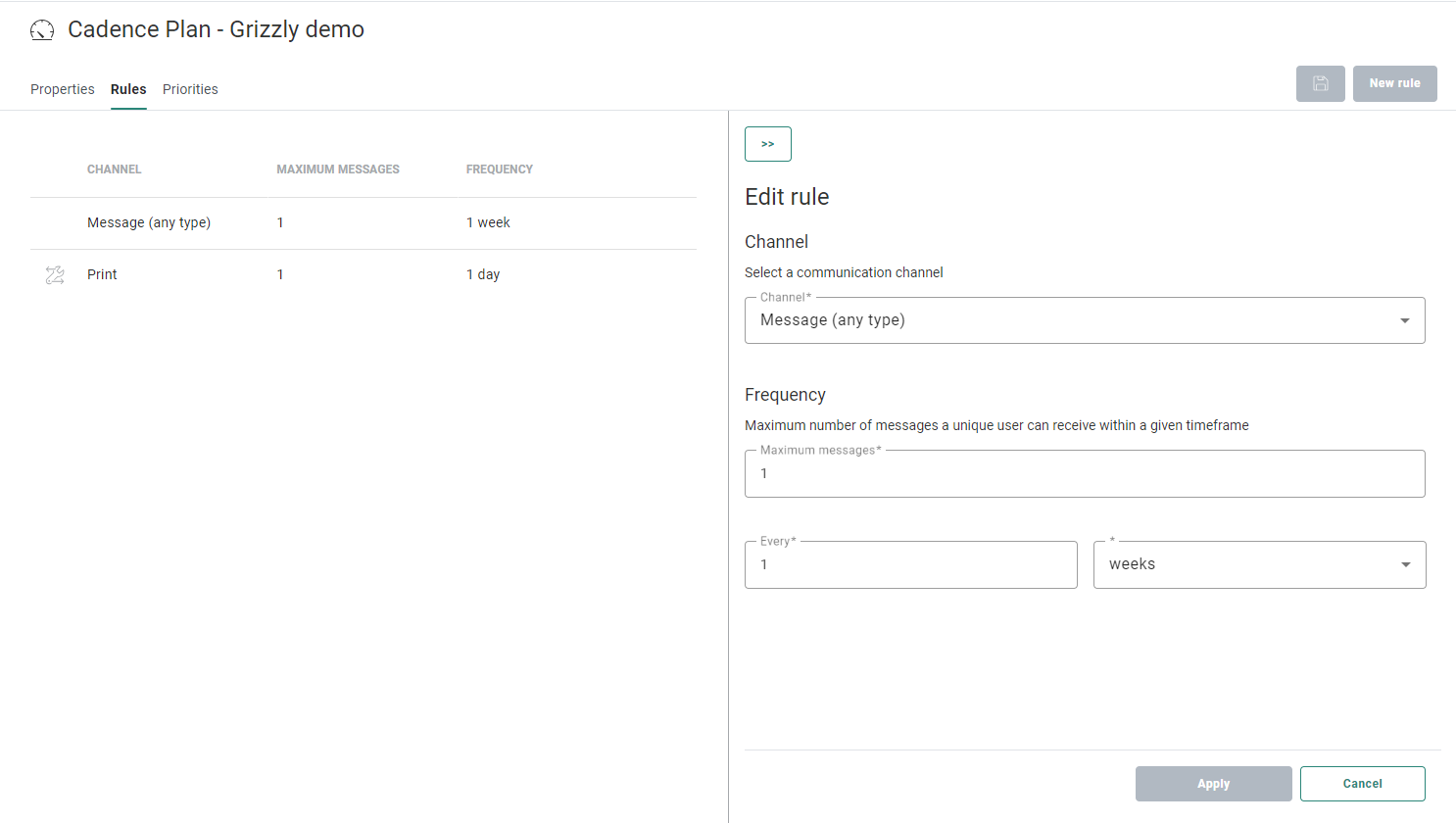 When creating a Cadence Plan, a default rule is automatically generated allowing a maximum of 1 message per week over all channels.