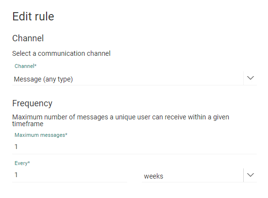 Example: If the first rule limits the communication to 1 message per day over all channels, and the second rule only allows one email per week, the first day 1 message over any channel can be sent, but the second day if an email was sent the day before, no more emails will be sent, but SMS or mobile messages can still be sent.