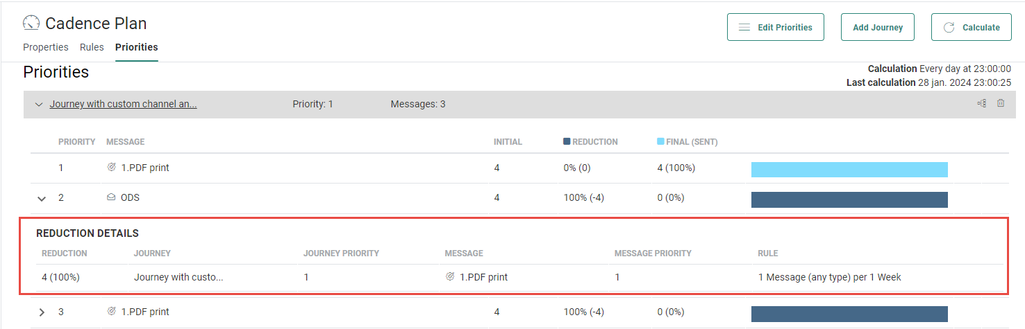 Example: In the screenshot below you can see that the target reduction for the message 'ODS' in the journey was caused by the first message '1. PDF print' by applying the rule '1 message per week for all channels'.