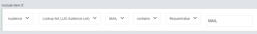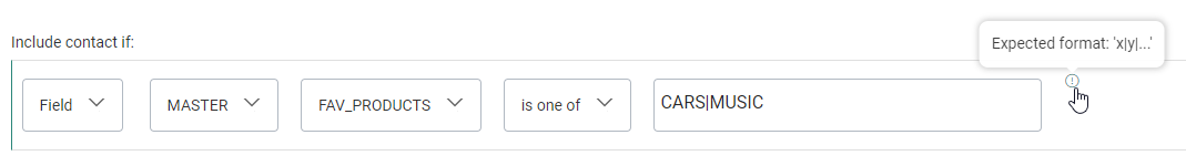| Example 6 | FAV_PRODUCTS | Text | is one of | cars, music | pipe separated manually entered text values |
