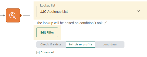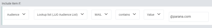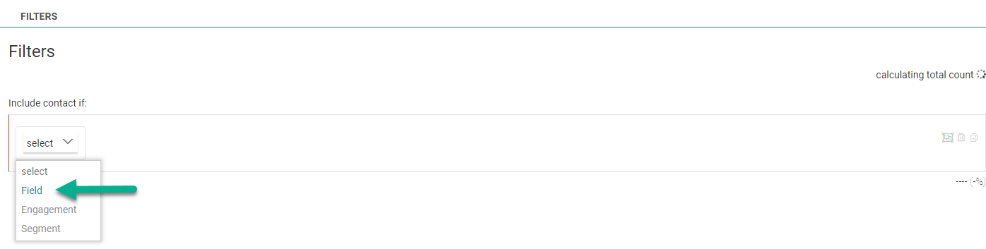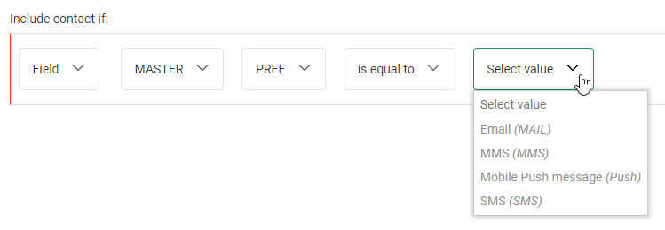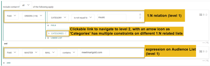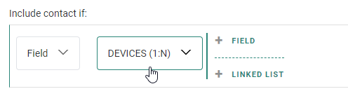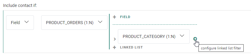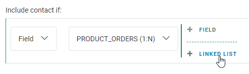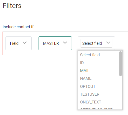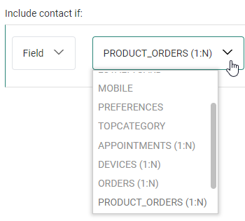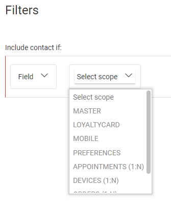 - Audience/Field — To set a filter on a field of the main list, or on a field of a 1:1 profile extension or 1:N / N:1 linked list.