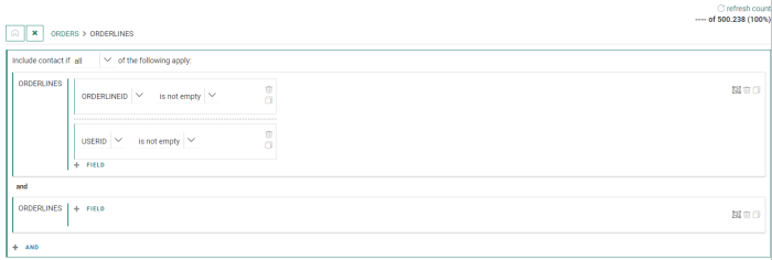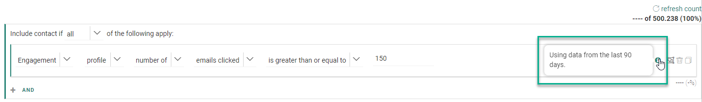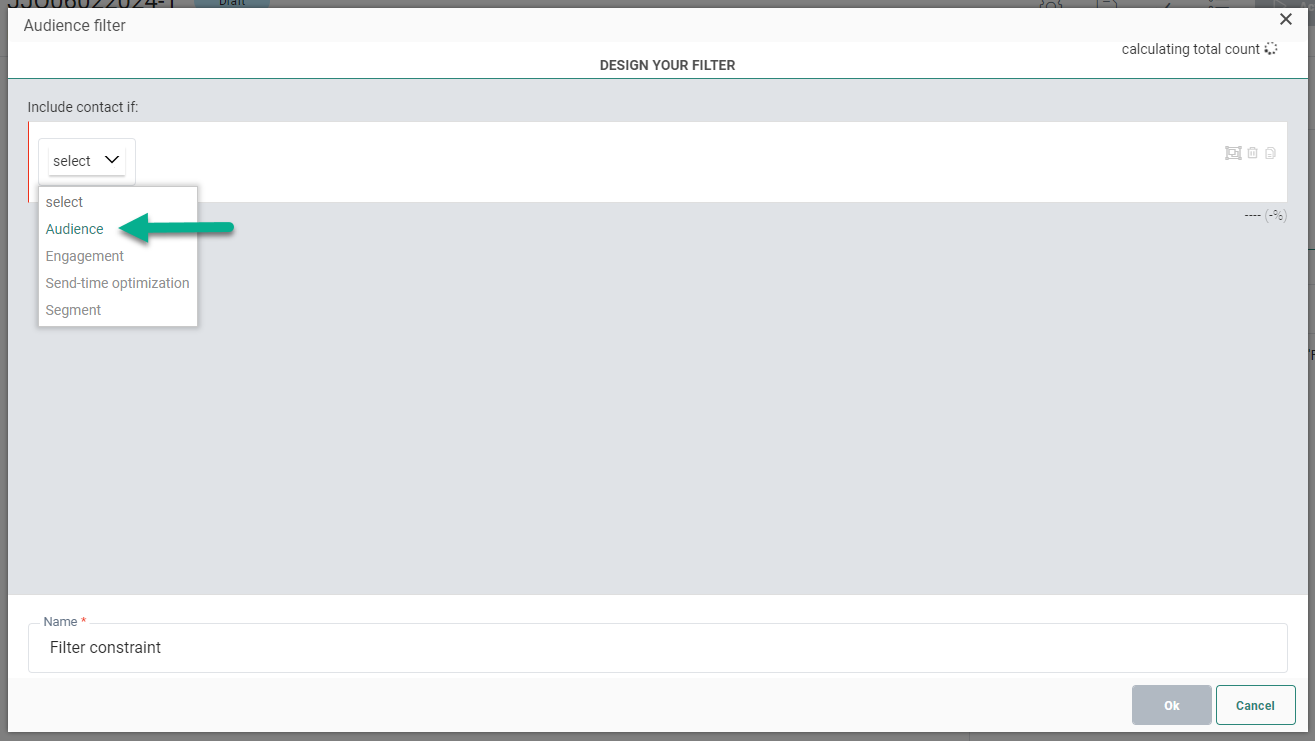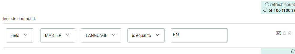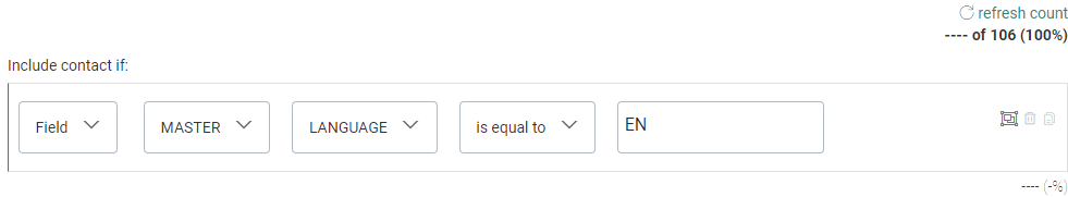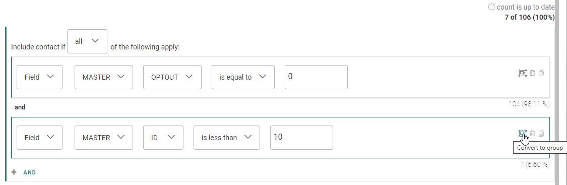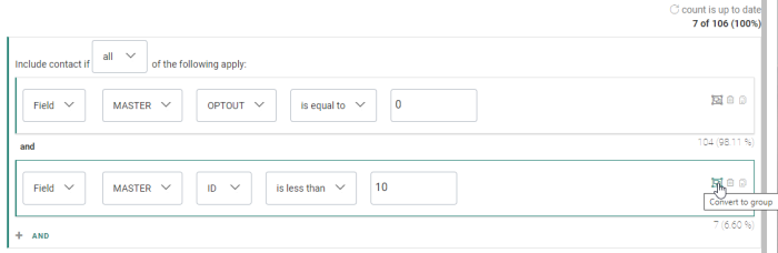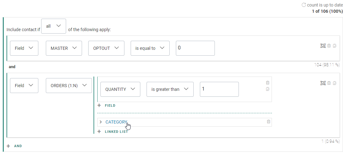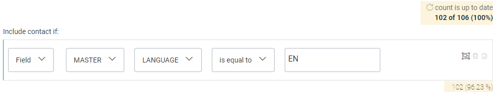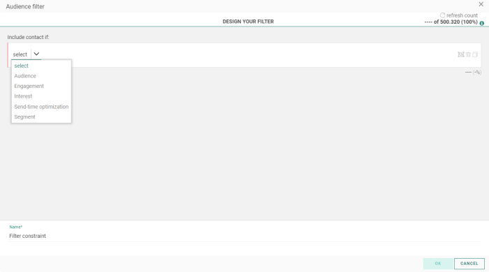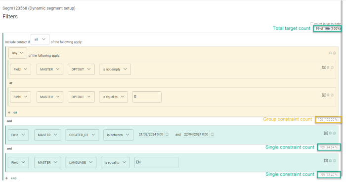 - When the calculation process is done, the single constraint shows a number and percentage value. This refers to the number of contacts and the percentage of the audience that are targeted with this constraint.