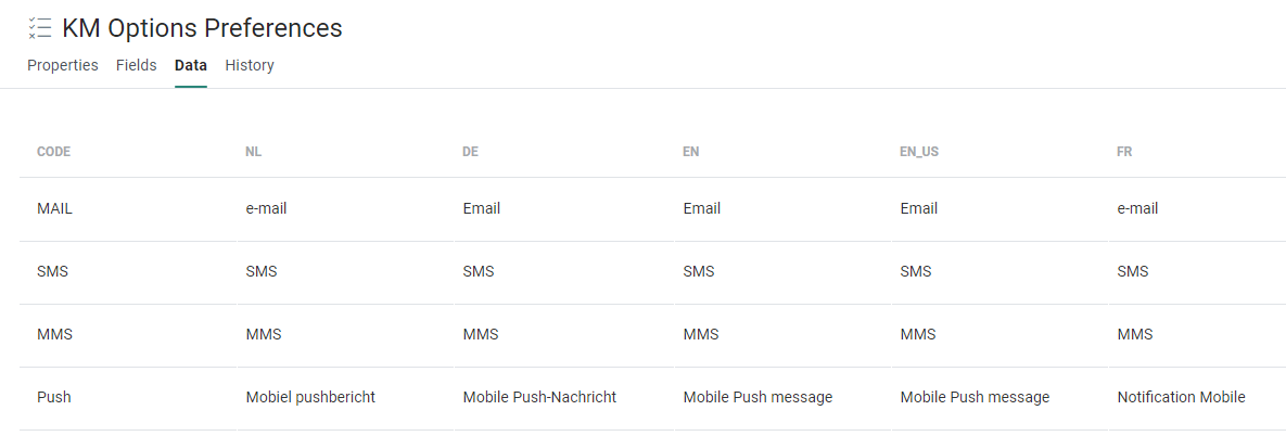 * The configured Option List with code and values per language:![]()