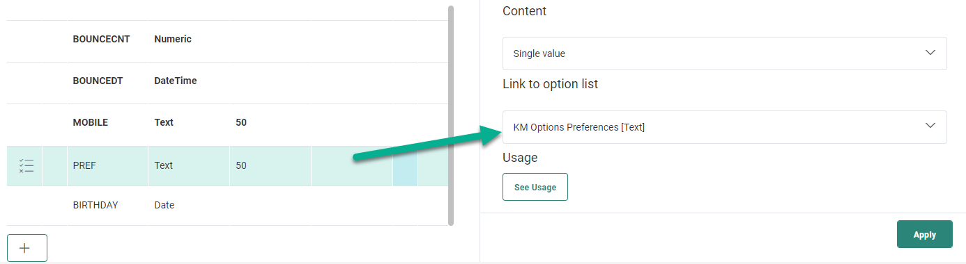 * The Audience List field that's linked to the Option List:![]()