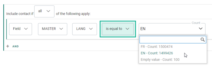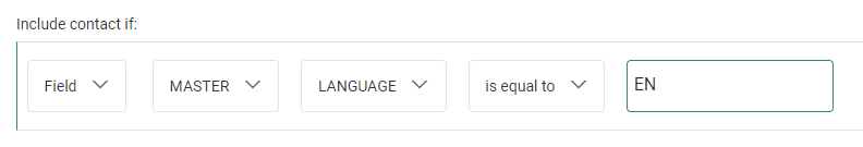 | Example 1 | LANGUAGE | Text | is equal to | EN | manually entered text |