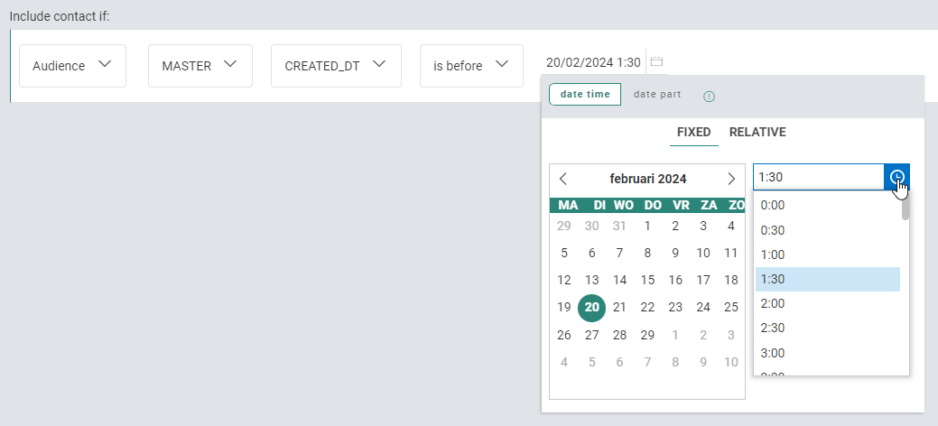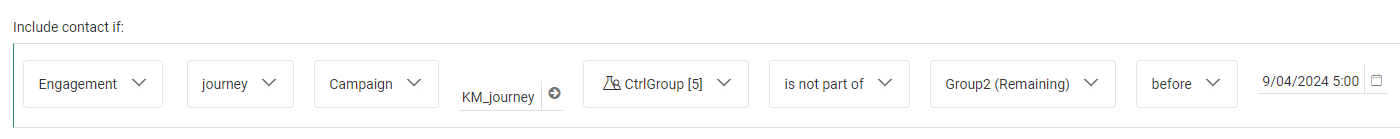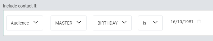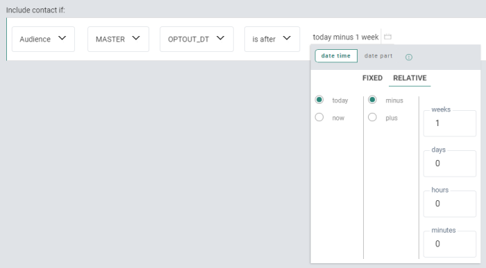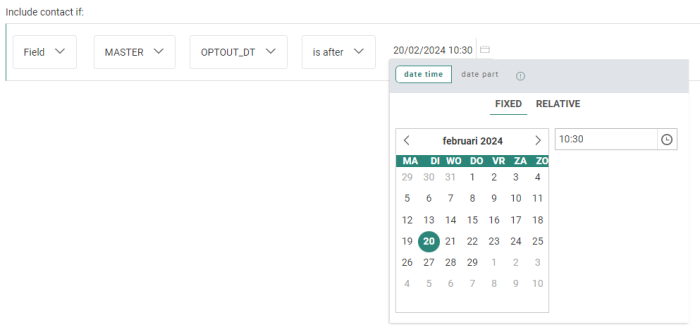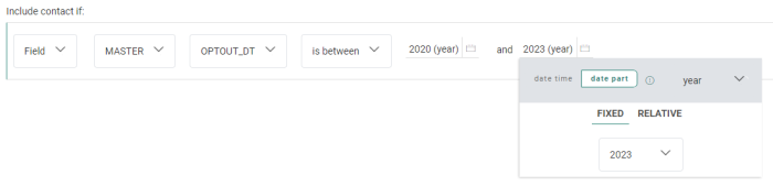 | Example 4 | OPTOUT_DT | Date/time | is after | 20/02/2024 10:30 | a date and time, selected through a date/time picker |