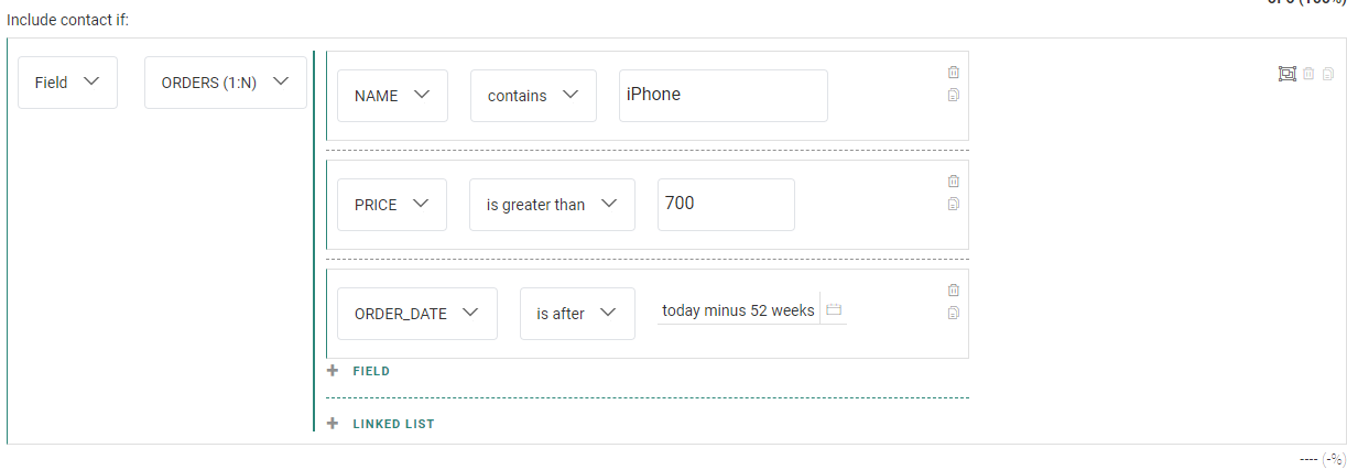 - A 1:N lookup list means 1 contact in the Audience List can link to one or more records in the linked list (for example, a contact can buy several times in your store, which results in an order each time they complete a transaction : MASTER → 1:N → ORDERS).