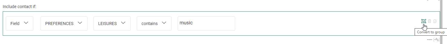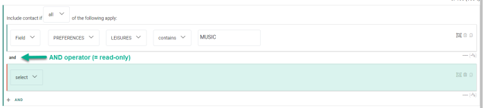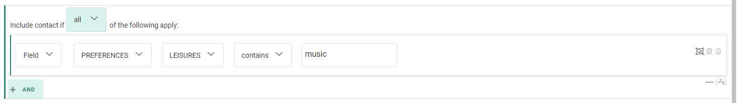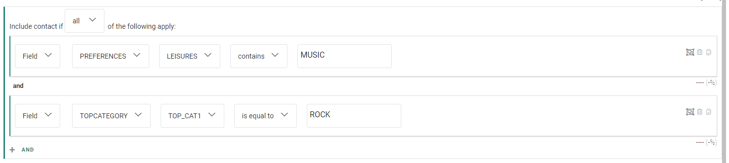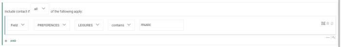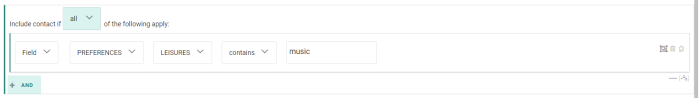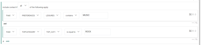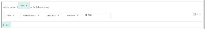 A group constraint containing two single constraints, looking for contacts whose leisure preference contains the value music, and whose top category 1 is equal to rock.![]()