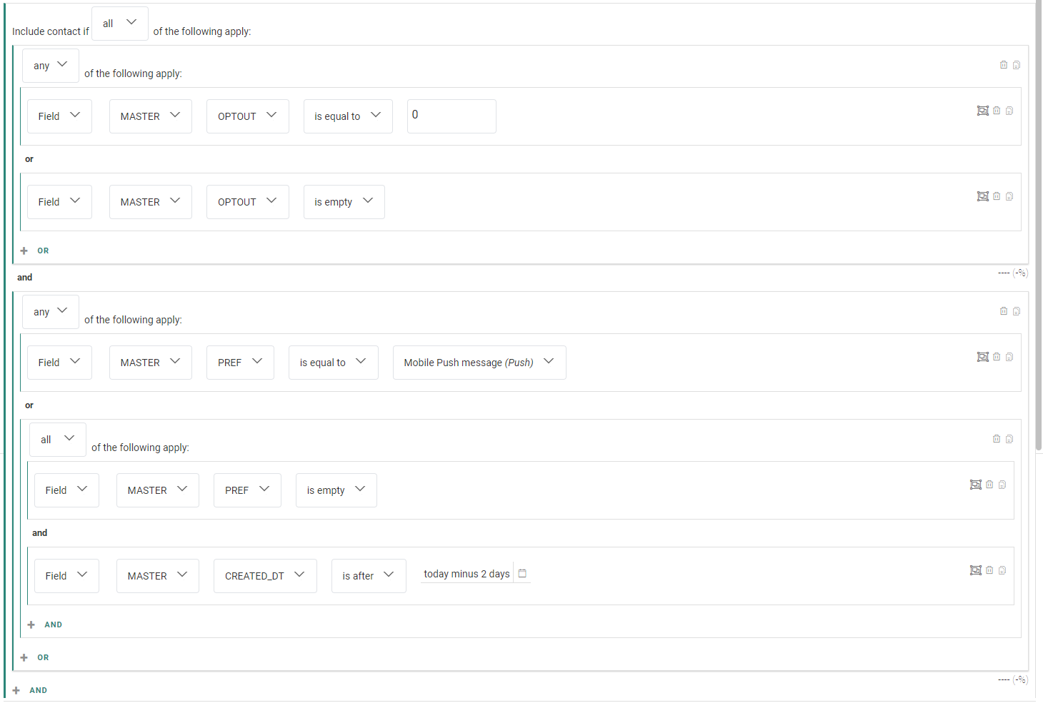 - The second group contains a single constraint (for the mobile push preferred channel) and a nested group constraint (for when no preferred channel is set, and it's considered to be a new contact).