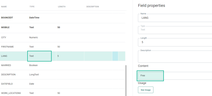 In an Audience List, the field LANG is of data type TEXT, and of content type FREE.