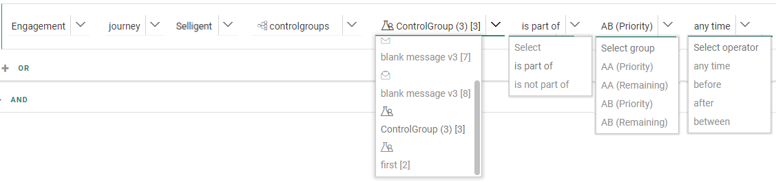 - Control Groups further drill down into an is part of/is not part of selection, priority/remaining group selection, and a time frame.