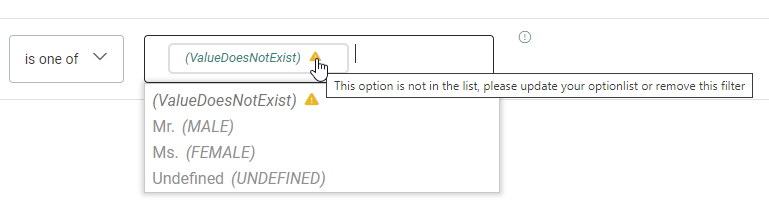 The opposite is also true, when deleting a value from an Option List that’s being used in a filter, will make the filter invalid, showing the warning icon next to the value that no longer exists. -