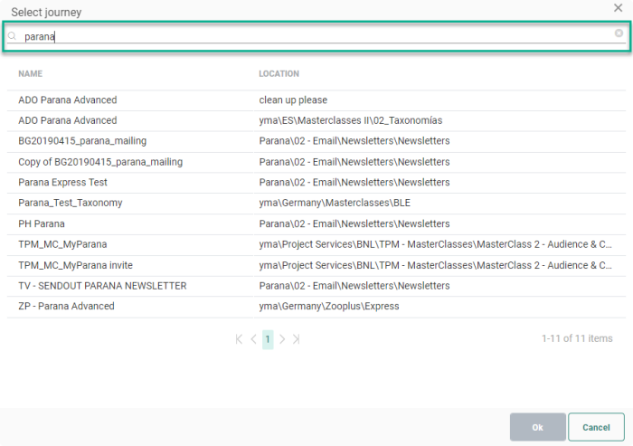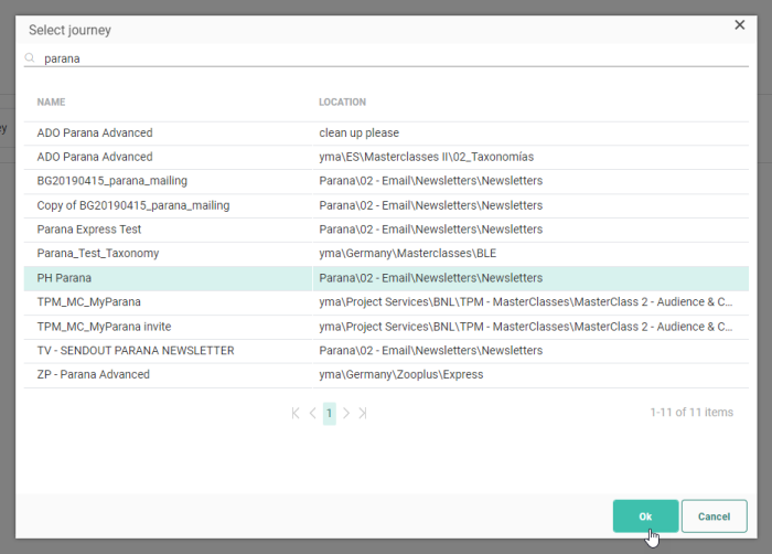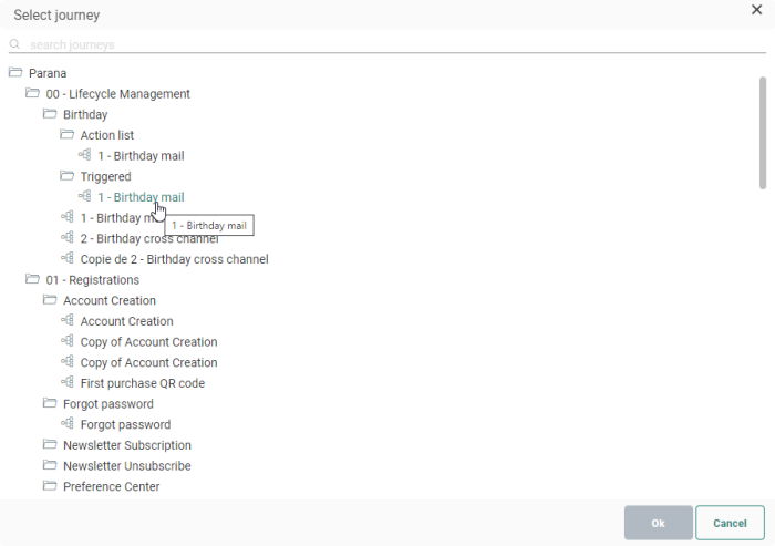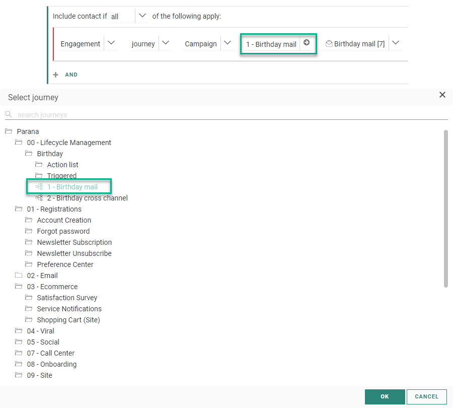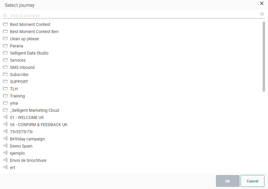 Note: When you've selected a Campaign journey before, and open the journey selector again for that constraint, the folders and sub-folders are expanded in which the journey is located and the journey is selected.