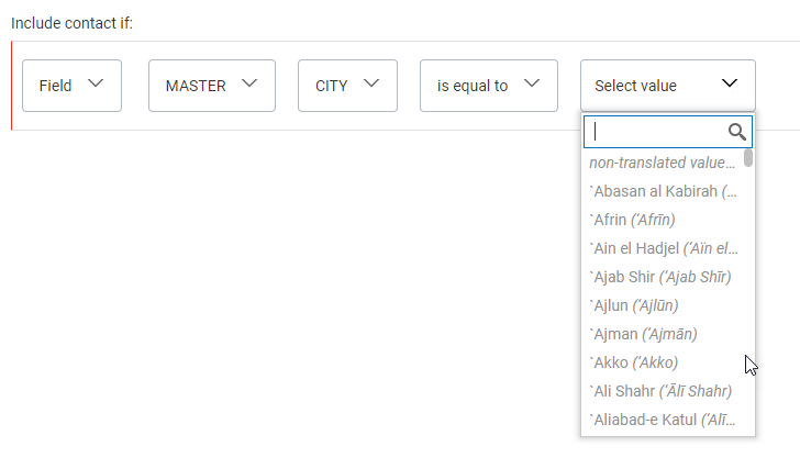 - For the equal to / is not equal to operators, you can search for a specific Option List value and select it.