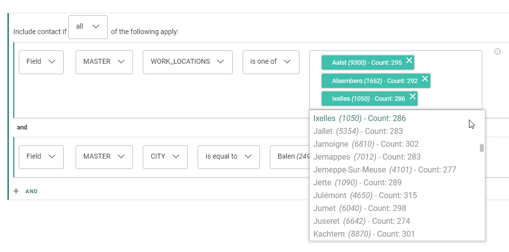 For certain field types (and in combination with certain operators), a count is shown for each field value based on how many times it's used in the selected list.