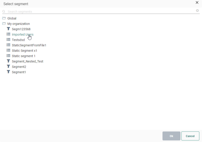 In the segment selector pop-up, you can navigate through the Global and My organization folders and select any segment of the audience.