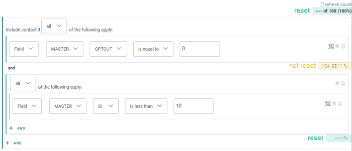 - The first group contains two single constraints (for the opt-out field check). It requires any of the single constraints to apply.