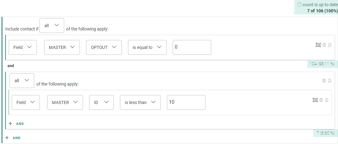 - Total target count — This is the highest level. It shows 'x of y (100%)', where x is the number of contacts that match all or any of the filters (depending on your selection), and y is the total number of contacts in the audience (which is also indicated by 100% next to it).