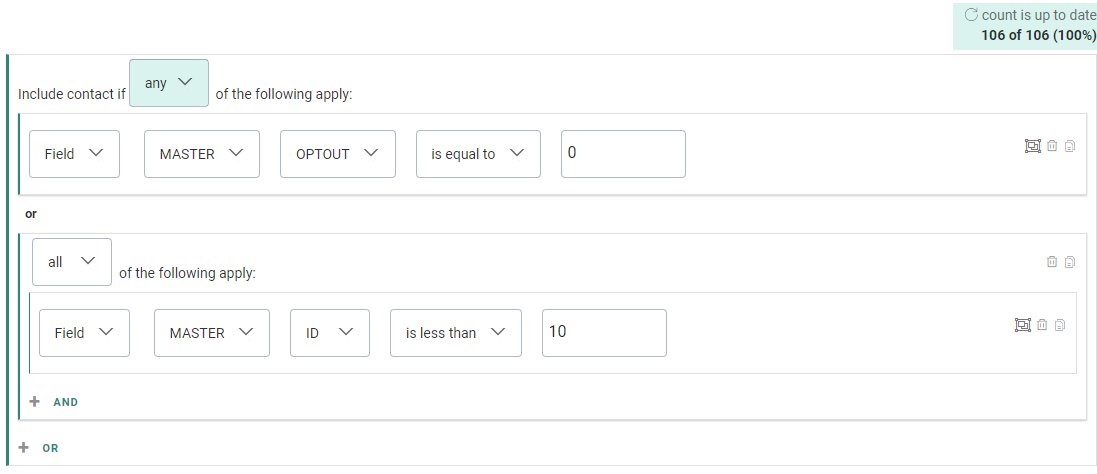 Note: When you select 'Include contact if any of the following apply' at the highest level, only the total target count is shown. No count numbers (or placeholders) are shown for single and group constraints, as that doesn't have any added value.![]()