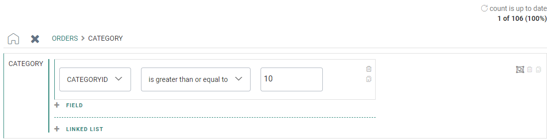 - Field values of data type Text and of content type Free, also show a count for the number of times they're used in the selected list, together with the Is Equal To operator.